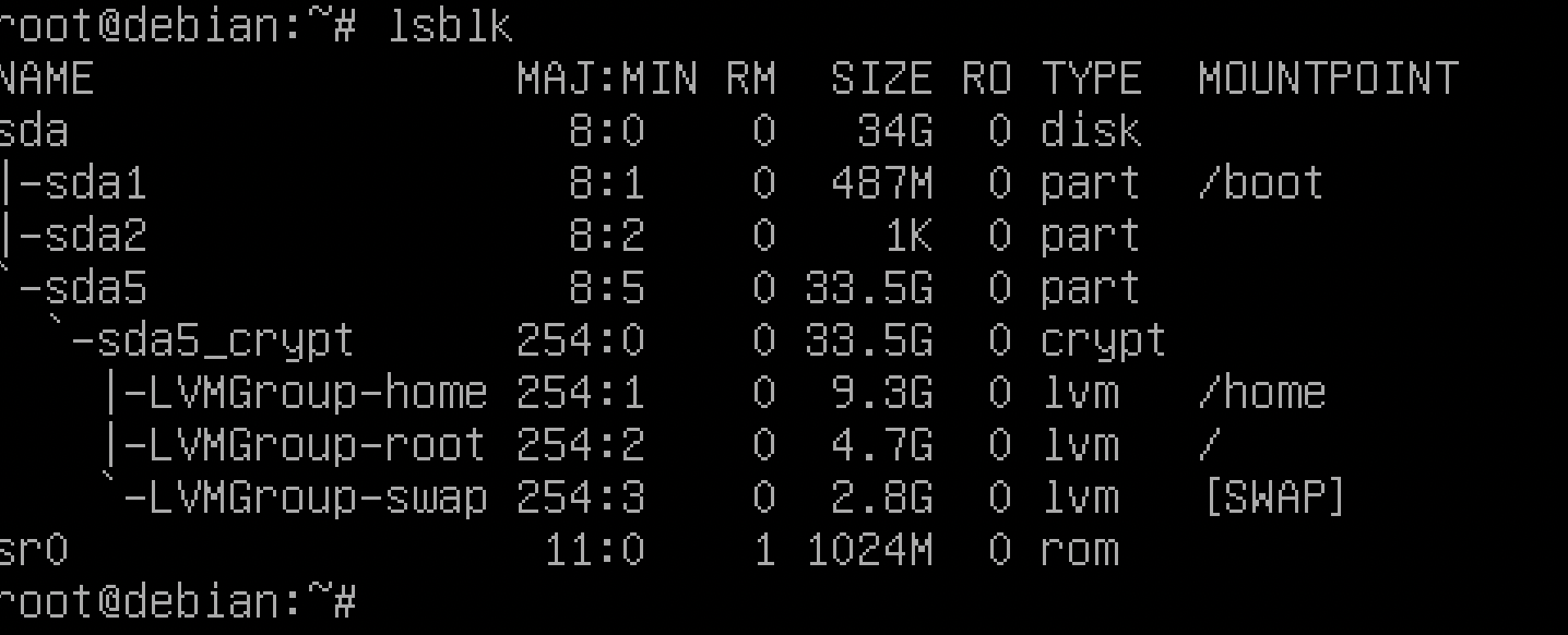 LVMGroup 내에서 각 home, root, swap 이라는 이름의 LVM 을 설정해주었다.