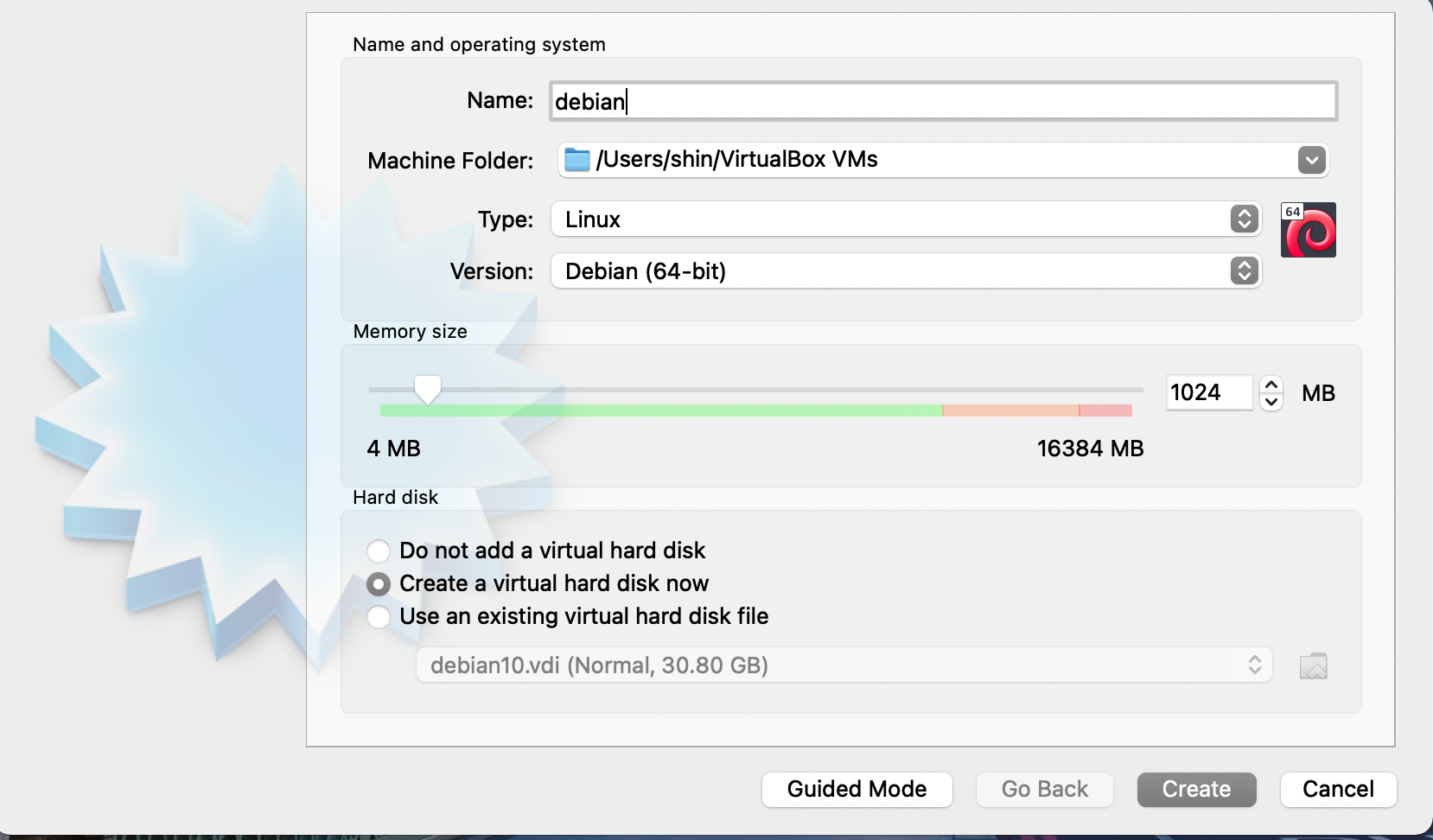하단의 조절 바를 통해, Virtual Size를 조정할 수 있다. 조절한 사이즈가 virtual machine 내에서 이용할 수 있는 용량이고,